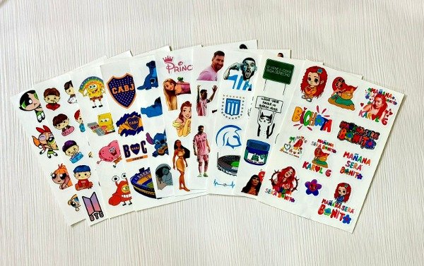 20 hojas a5 con precio mayorista. Los stickers son de vinilo a prueba de agua, rayones y al sol, tienen una terminación glitter.